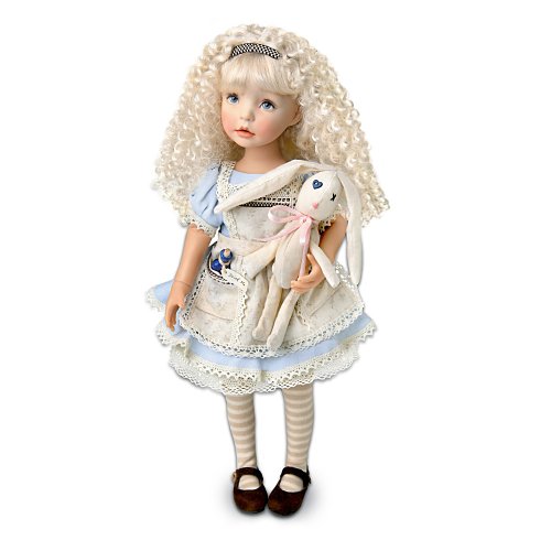 Once upon a time there was an inquisitive little girl who followed a white rabbit into a strange world. Now, Alice is back from Wonderland, in a fresh, new look achieved with the expert sculpting and hand-painted features of Master Doll Artist Dianna Effner's award-winning signature style. Available only from The Ashton-Drake Galleries, this unique Alice doll is the winner of the 2011 DOTY Award and is also sure to win your heart!This Alice in Wonderland-inspired child doll is handcrafted in collector-quality vinyl with hand-painted features. She has 11 rotating joints so she can be posed in a variety of realistic ways. Filled with charming details from the classic children's story book, Alice wears a blue dress and a white apron with a pocket big enough to hold the included "Drink Me" bottle. Plus, she arrives with a cloth white rabbit for added enchantment! Strong demand is anticipated, so don't wait. Order now!