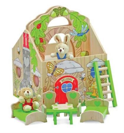 The Melissa and Doug Fold and Go Treehouse is stocked and ready for on the go fun! The wooden treehouse opens up for even more play space! This adorable set includes a plush bear and bunny. Use the 5 pieces of furniture to decorate both levels. Colorful, interesting designs add to the fun! The Fold and Go Treehouse folds shut and includes a chunky handle for easy transport and storage. Read more...